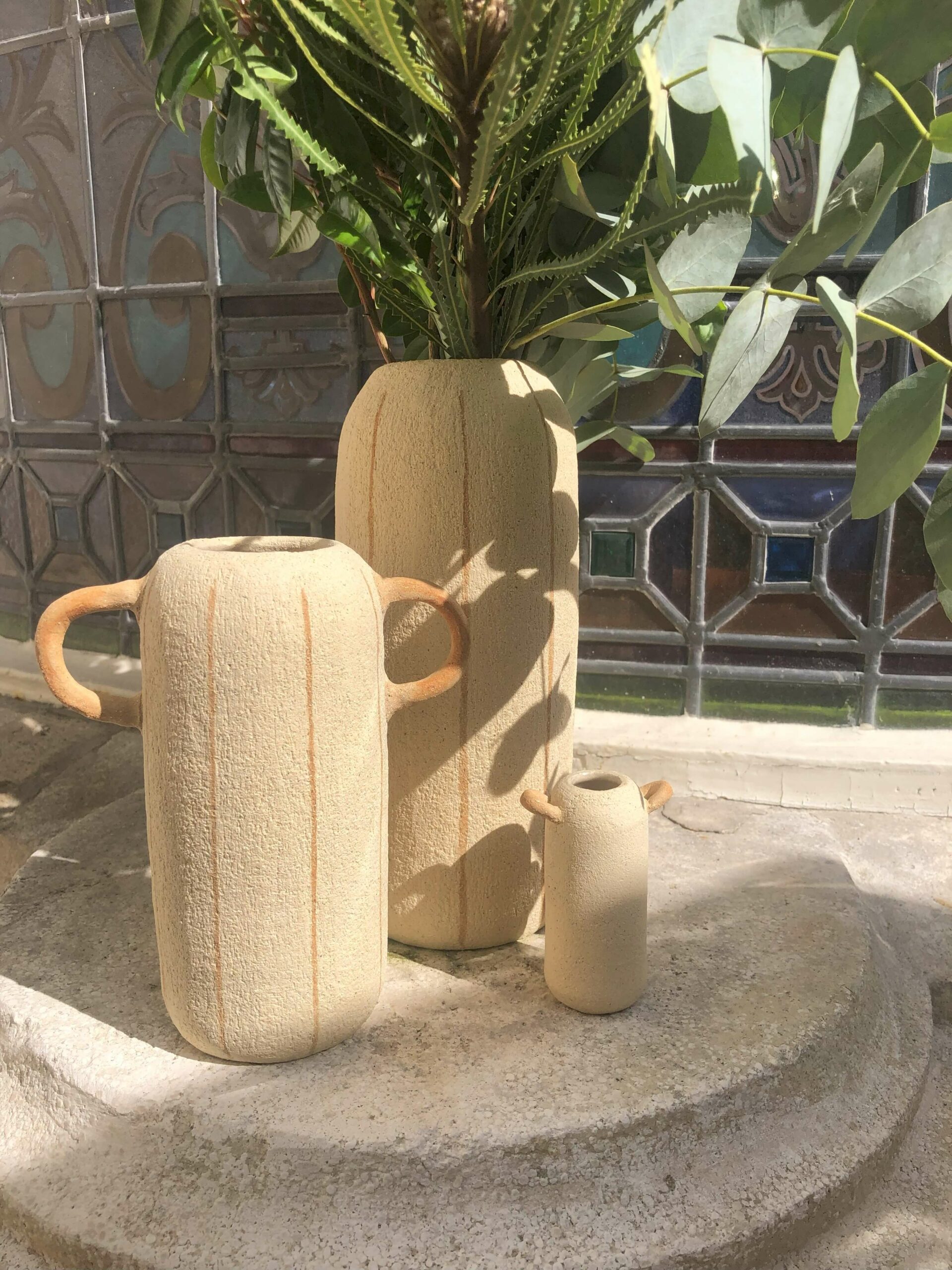 Jarre sobre et élégante, façonnée à la main dans des tons beiges doux, célèbre la pureté de la forme et la simplicité des matières. La terre naturelle, subtilement travaillée, révèle des nuances organiques qui capturent la lumière de manière délicate. Son design intemporel et épuré en fait une pièce polyvalente, capable de s’intégrer avec élégance dans tout type d’espace. Une création qui incarne l’harmonie entre la fonctionnalité et l’esthétique minimaliste.