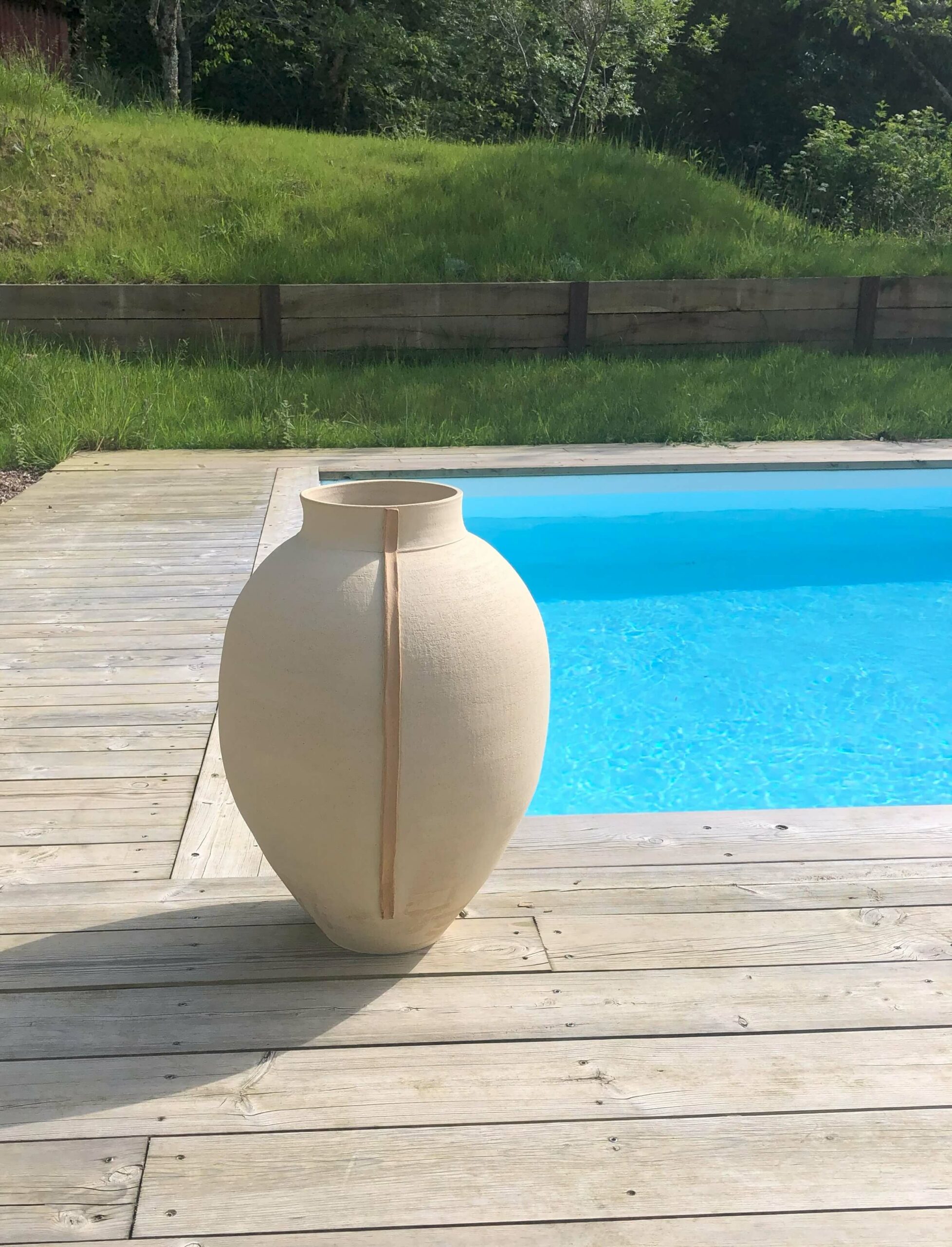 ”Point à la ligne” – Jarre en grès blanc chamotté, soulignée d’un trait de grès roux. Une pièce unique où la matière s’exprime avec simplicité et caractère.